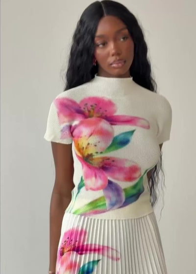 Our Blossom Print Top is a soft statement piece designed to turn heads. Featuring a delicate watercolour floral print on a fresh cream base, it blends femininity with modern elegance. The sleek high neckline and sculpted fit create a flattering, polished silhouette. Perfect on its own or paired with the matching Blossom Pleated Skirt for the ultimate coordinated look.